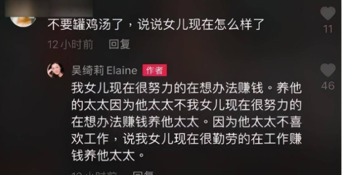 结果没有想到吴绮莉真的回复了,她是这样说的:“我女儿现在很努力的在想办法赚钱养她的太太。因为她太太不喜欢工作。”