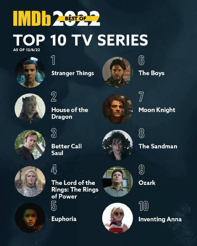 最近,IMDB公布了自家平台的2022年十大最热美剧,这些剧集不一定是口碑公认最好的,但肯定是人气最高的,其中《龙之家族》《指环王》《黑袍纠察队》《亢奋》等剧集顺利入围十大年度大热,下面就一起来看看吧!