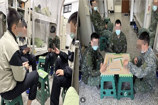 据台湾ETtoday新闻云报道,一名网友近日在岛内论坛PTT分享,有名男子日前在社交媒体Ins上发布了数张照片,向亲友炫耀自己的军中生活。根据照片画面,除了有一张9人合照以外,其余的照片都十分离谱,有身着军装的男子在板凳、围棋盘组成麻将桌前打麻将,还有人在玩扑克牌。