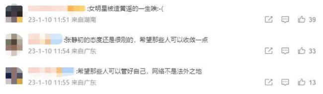对此,不少网友纷纷表示:“网络不是法外之地”、“女明星被造谣的一生”、“张静初的态度好刚”。