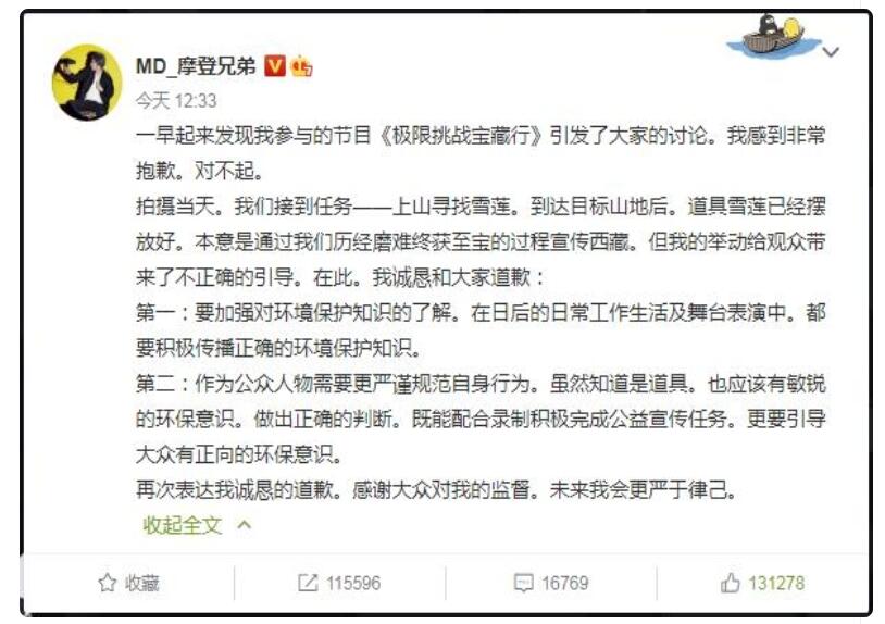 拍摄当天,我们接到任务——上山寻找雪莲。到达目标山地后,道具雪莲已经摆放好,本意是通过我们历经磨难终获至宝的过程宣传西藏,但我的举动给观众带来了不正确的引导。在此,我诚恳和大家道歉: