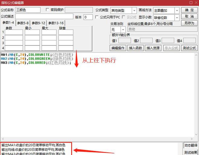 通达信的指标公式代码从上往下执行(如下图),先画白色,再画绿色,最后画红色,就像画画一样,后面涂的颜色把之前的颜色覆盖了,最后均线颜色就显示红色。
