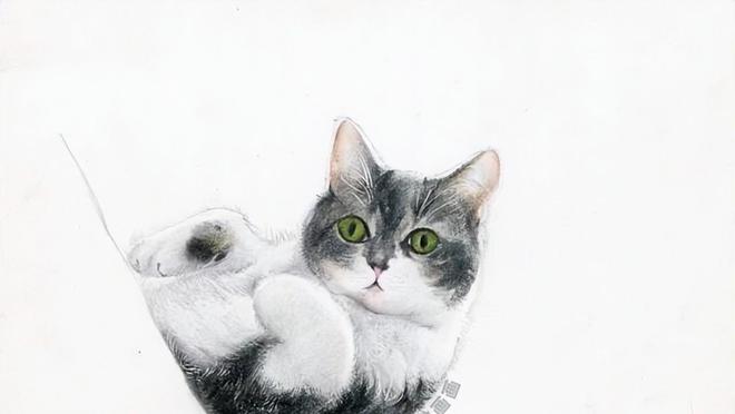 >>>【第5步】:继续用(10号灰色)画猫咪身上的灰色花纹,颜色重的地方用力画。花纹的边缘用小笔触画出毛发的质感。(白色的毛用没油的笔芯在纸上画出痕迹,一只留白到最后)(P5↓)