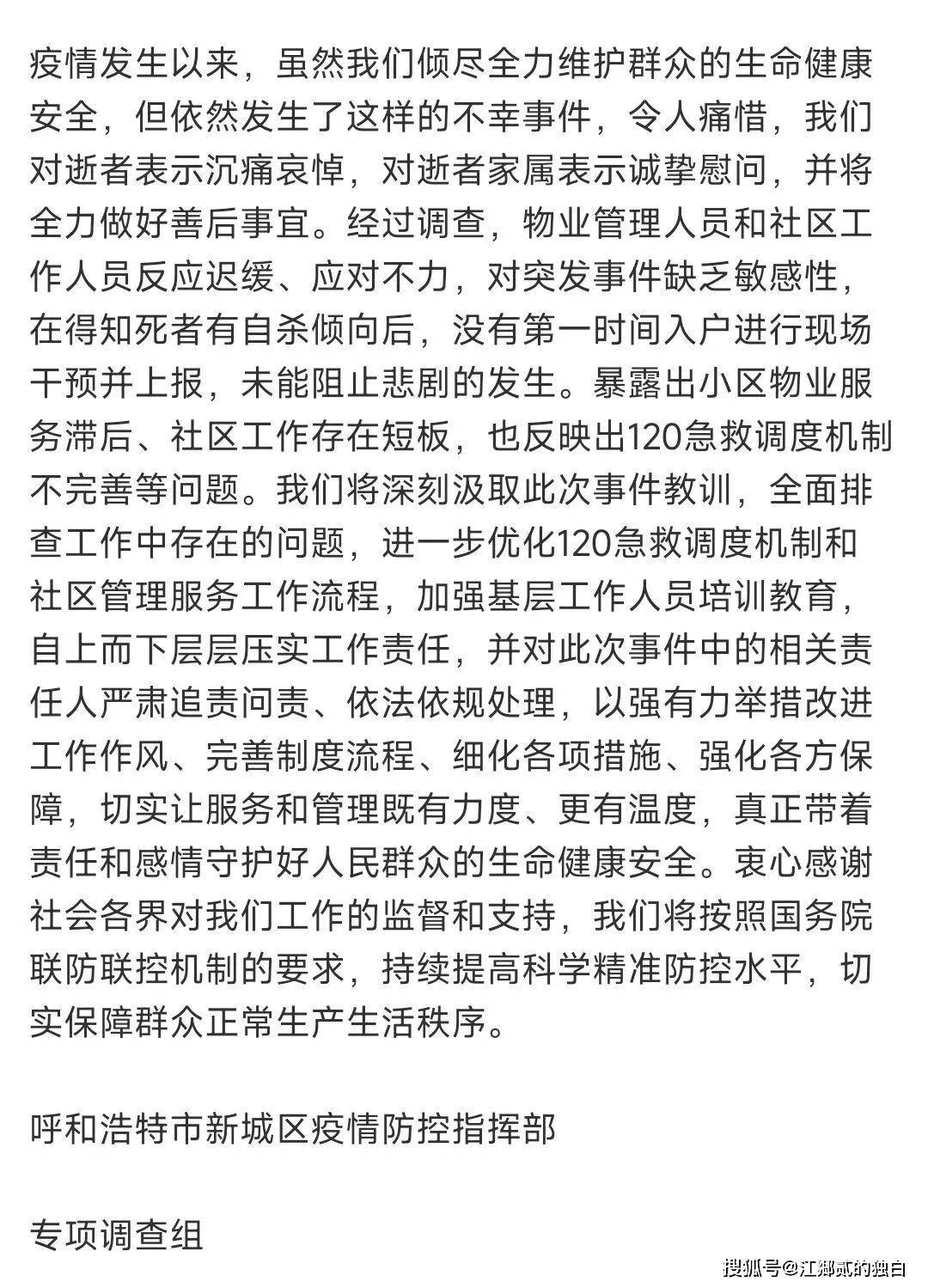 中午时分,呼和浩特新城区疫情防控指挥部专项调查组公布了“女子坠楼事件时间线”,这样的还原真实性让人感觉到调查组的认真,以事实来讲述引发悲剧发生的问题。