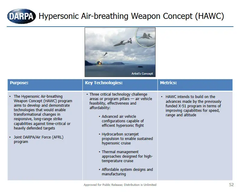 据美国空军杂志网站1月30日报道,美国国防部高级研究计划局(DARPA)1月30日宣布,DARPA和空军对超燃冲压发动机驱动的“吸气式高超声速武器概念”(HAWC)导弹高超声速吸气武器概念导弹进行了最后一次飞行测试并取得成功,该项目的“研究结果现在将用于后续工作”。