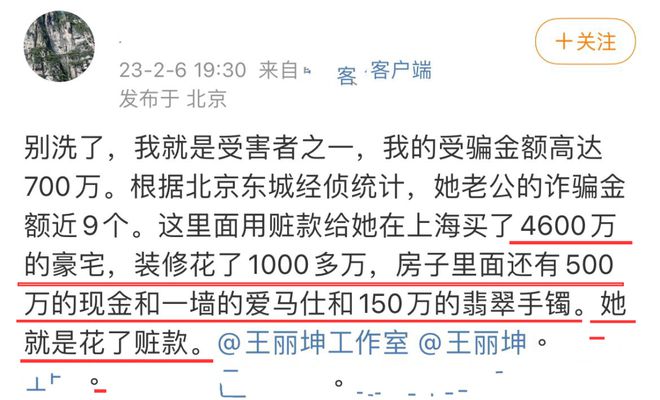 也已经有受害者出来发文了,在其发文的内容中,明确地表示了王丽坤就是在花赃款,她老公用赃款给她在上海买了一栋4600万的豪宅,该豪宅装修花了1000多万,而且豪宅里面还有500万的现金,一墙的爱马仕以及150万的翡翠手镯,而王丽坤也是属于花了赃款。