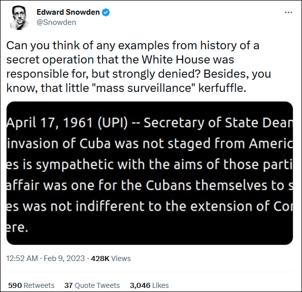 推文中,斯诺登还附上了发表于1961年4月的一篇有关“猪湾事件”的新闻报道。在这篇报道中,时任美国国务卿的迪安·鲁斯克否认“猪湾事件”是“从美国领土发起的”,鲁斯克当时告诉记者,“古巴发生的事情属于古巴人自己解决的问题”,但美国对共产主义政权的敌人表示同情。