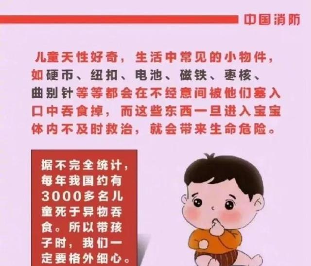 家长一定要经常叮嘱孩子,不要随便将东西放入口腔,像小的玩具配件,钉子、塑料棒、玻璃弹珠、硬币、缝衣针,枣核等,这些可吞咽的东西一定要远离孩子。