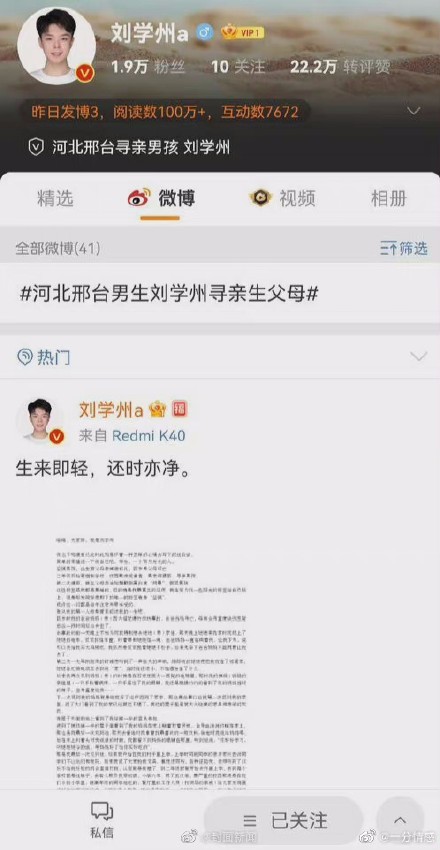就在一个月前,刘学州才在河北警方的帮助下寻亲成功。一个月后,他在抖音、微博等社交平台表示自己再次被抛弃:被亲生母亲拉黑。17日,某媒体记者联系到刘学州本人,他告诉记者,一切都是因为“提到了利益的问题”