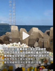 【一路走好!刘学州事发海边堆满鲜花和甜品,刘学州遗体火化亲生父母未到场】1月27日,海南三亚。在三亚当地警方等有关部门积极协调下,刘学州遗体火化问题得到解决,骨灰将由其舅舅(养)带回河北老家进行安葬。