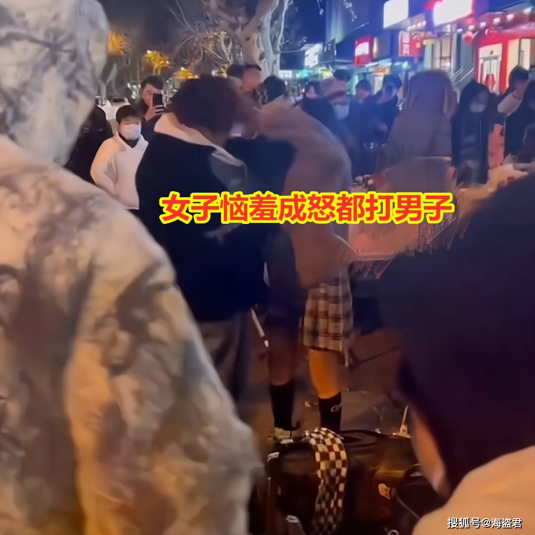 这么多人围观,自己的遮羞布被当众揭穿,女生一听急了朝着男友的头打过去。