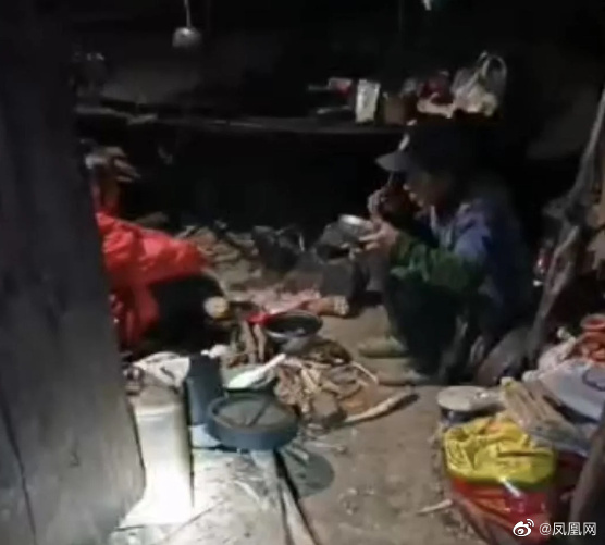 【干啥嘞?!主播在凉山发钱被指发3000收回2800】破旧的房屋,昏暗的灯光,老人和小女孩在火塘边吃饭,身旁杂物堆积,主播指着低矮的小屋说,“这是祖孙两人居住的地方……”