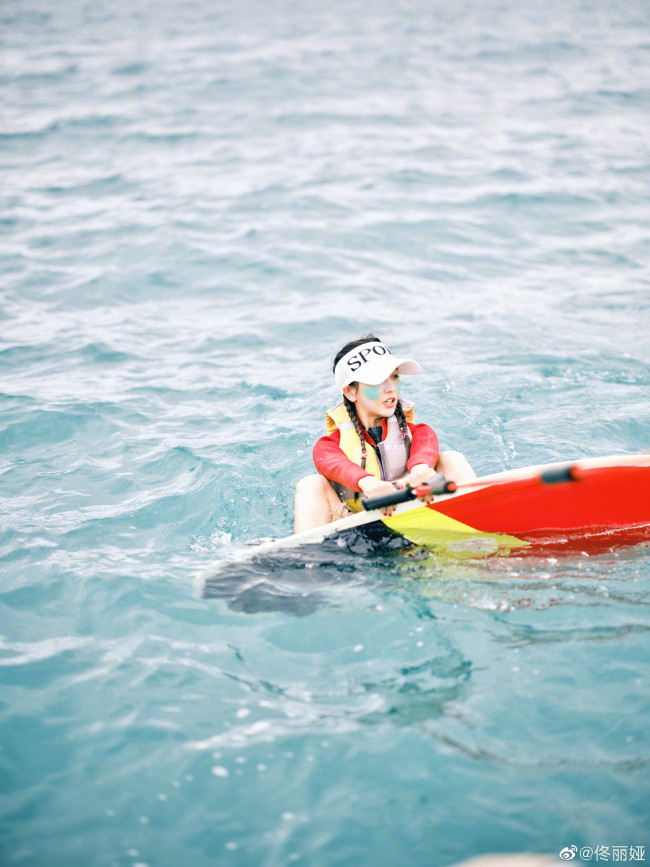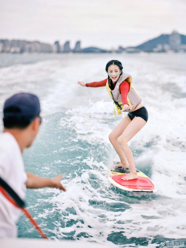 佟丽娅玩冲浪长腿吸睛 扎麻花辫元气活力