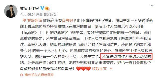 不少粉丝慕名而来,却传出黄龄不慎摔下舞台的消息,让人揪心。在次日晨,黄龄工作室发表太高,表示姐姐不慎踩空摔下舞台,演出中断三分钟重新站上去后,她仍然坚持唱完预定节目,随后被送到医院检查和治疗。