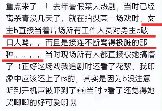 一开始,有网友在某瓣发文,称某对大热CP的女主,曾经在电视剧拍摄片场,当着片场的工作人员,对男主破口大骂,甚至是接连不断地用脏话问候。