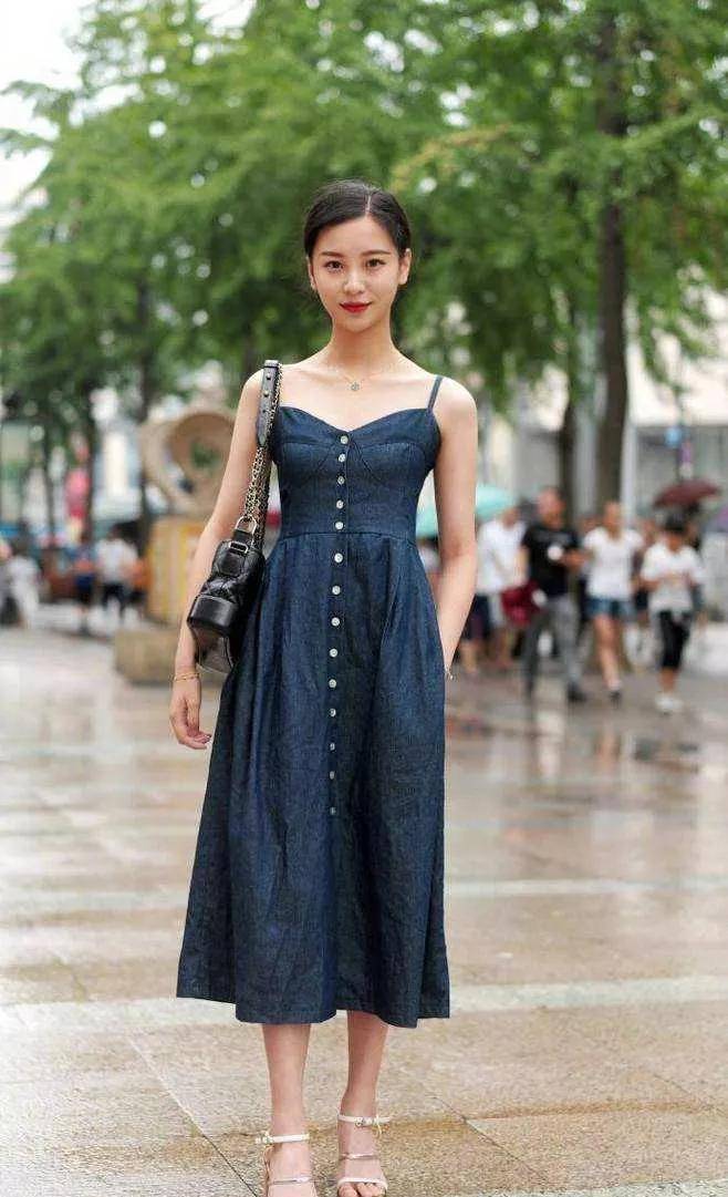 在夏天,雨后的街头总是带着些许的凉意,让人感受到清凉与舒适。小姐姐穿搭着一件深蓝色的牛仔吊带连衣裙出街,单排扣的设计让整体显得不再单调。高腰的设计能够让划分出完美的身材比例,结合一双一字带高跟凉鞋穿搭出街,让她整体看上去更显高挑的魅力。