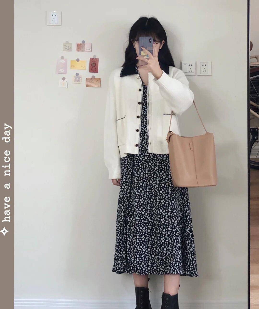 除了这种比较精致的甜美风的开衫之外,也还有一种看起来属于小香风那一挂的针织开衫,看起来也是非常的温婉淑女,那么这种开衫在搭配的时候就可以选择搭配同款类型的裙子,比如碎花连衣裙。纯白色的针织开衫采用的是黑色的圆形扣子,那么在搭配上就可