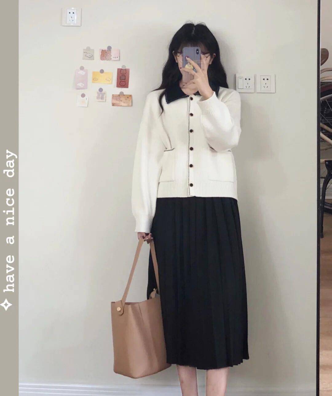 翻领设计的连衣裙也是比较温婉的,是非常显气质的,那么搭配这个白色的针织开衫也是非常可以的。在搭配的时候把开衫的扣子全部扣起来,然后露出裙子的翻领,会显得很优雅,露出的下半部分裙子则是很经典的百褶裙款式,显得非常淑女。