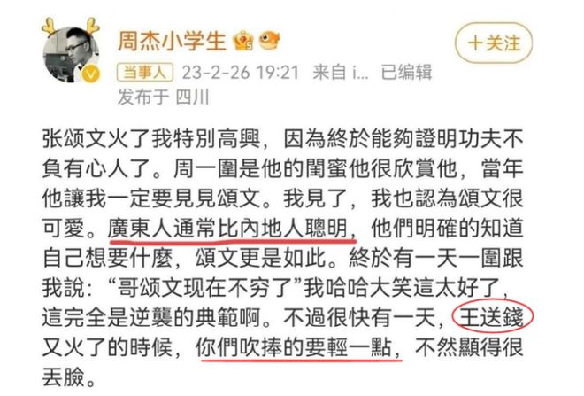 除此之外,周杰还在微博中暗讽张颂文花钱买热度,小心日后翻车,明面上夸张颂文聪明,实际意思是说他狡猾,而且还措辞不当,夸广东人比内地人聪明,但广东也是我国领土的一部分,怎么还能和内地分割开来呢?