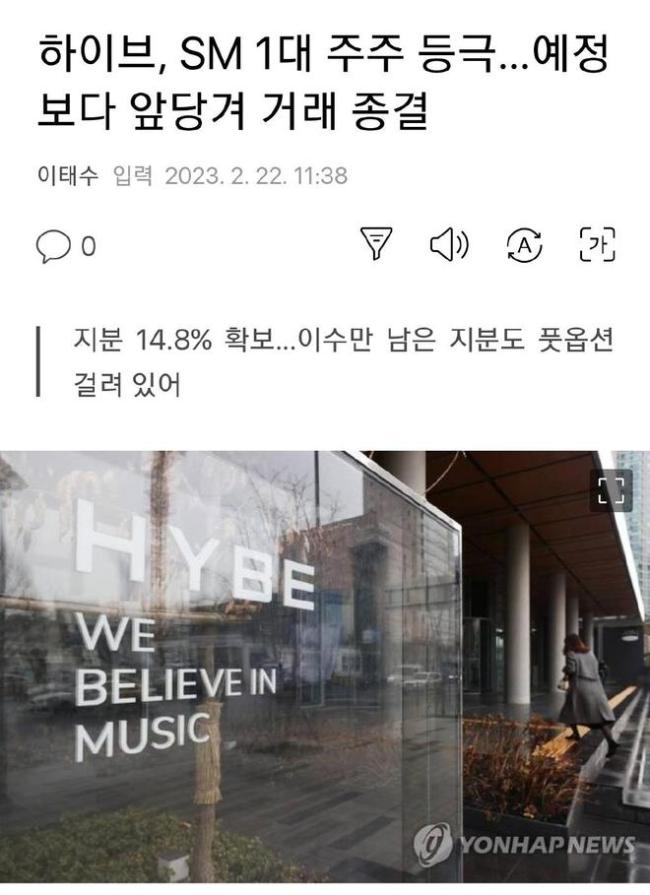 HYBE公布,提前以4228亿韩元(约合人民币22.5亿元)的价格收购SM娱乐大股东兼前总制作人李秀满持有的14.8%的股份,通过此次交易一举成为最大股东。HYBE原定购买SM股份的预定日期是下个月6日,但比这提前12天支付了货款,最终完成了交易。