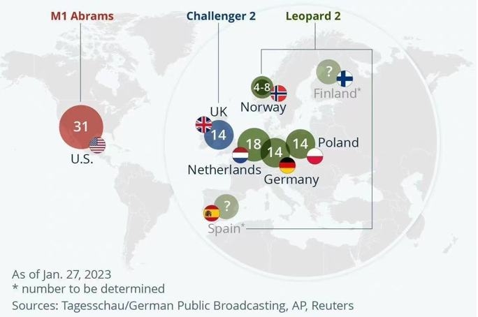 下图中的白色数字是各国豹2的保有量(包括需要修理的坦克),蓝色数字是他们打算送给乌克兰的数量: