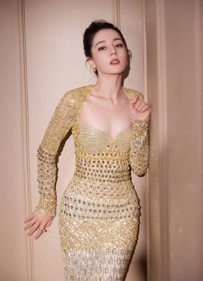 迪丽热巴身穿金色水晶缀饰长裙,她俏脸明艳动人,浓眉大眼,樱桃小嘴,乌黑的秀发盘在脑后,她侧身仰望远方的样子,美得让人窒息!