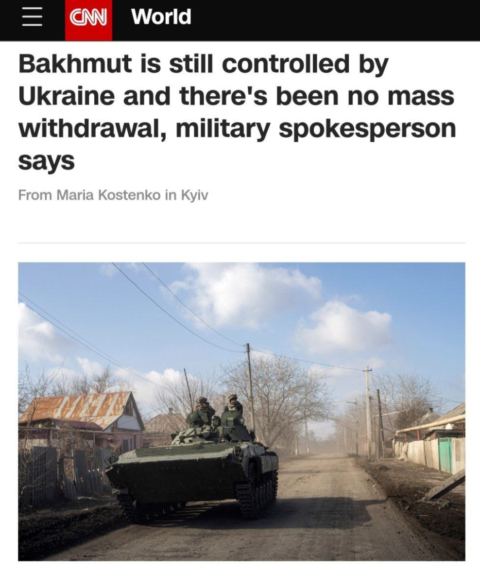 《华尔街日报》的前方记者也证实了乌军丢失补给线和俄军进入城区的消息,面对附近俄罗斯军队的炮火、迫击炮和火箭弹,乌克兰士兵主要在巴赫穆特城内及周边地区的战壕中作战,通往更安全地带的路线所向无几。乌克兰军事人员表示,俄罗斯武装人员已经占领了该市某些地区的阵地,但当地的防御部队仍然控制其他地方。