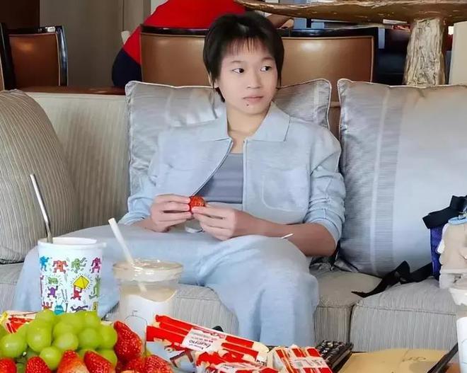 当天全红婵这时,在一所全新的房子里。全红婵坐在沙发上,穿着运动服,很随意。这时,全红已经16了。
