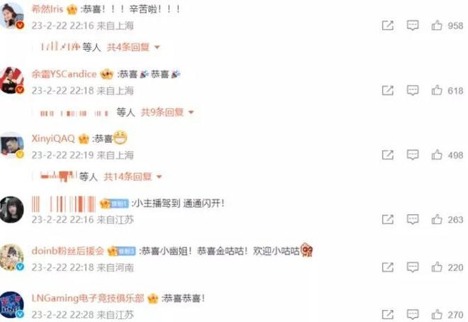 消息传开之后,很多圈内友人也是纷纷前来wb评论区送上祝福,恭喜doinb和糖小幽升级身份成为人父人母,当中就有大家都比较熟悉的LPL主持人希然、余霜,还有doinb的前队友xinyi,以及老东家LNG...等等等!最后,小星也是要恭喜doinb和糖小幽祝福一家三口幸福美满!
