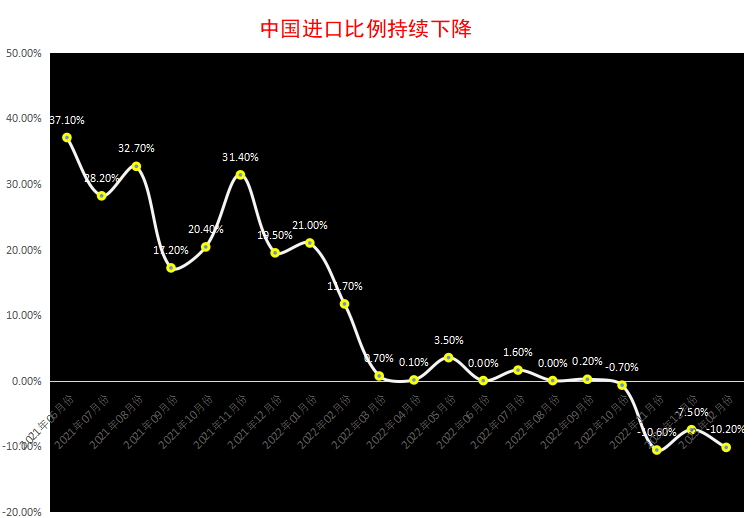 另外,随着人民币国际化的步伐不断加快,中国到国际上购买商品,很多时候也不需要使用美元了,而是直接使用人民币就能购买了。根据《央行发布2022年金融统计数据报告》,2022年中国货物贸易进出口总值首次突破40万亿元,达到42.07万亿,货物贸易项下人民币结算规模已达到7.92万亿元,同比增长37%。还有,随着美国“闭关锁国”,俄乌战争导致欧洲日渐变穷,中国进出口金额大幅度减少,也减少了我们对美元的需求。面对欧美国家的“围堵”,为了减少风险,我们也制定了“加强内循环”政策,减少对国际的依赖。从2022年11月开始,中国进口比例不断负增长,2023年1-2月,中国进口再次出现大幅度下滑,同比增长为-10.2%。