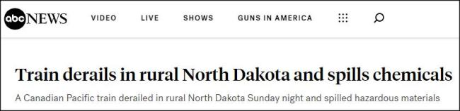(观察者网讯)美国近日又发生一起列车脱轨导致化学物质泄漏的事故。据美国广播公司3月27日报道,一列载有危险化学品的火车26日在美国北达科他州脱轨,事故没有造成人员伤亡,但部分化学物质发生泄漏。当地应急人员和专家正在清理泄漏物质,周边多条道路已被关闭。