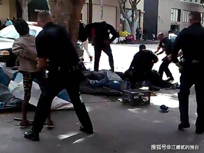 起先,双方只是在沟通,可是其中一名保安走过去,对着女子挥动了拳头,其他人没有做任何的阻止,女子的表情有些痛苦。