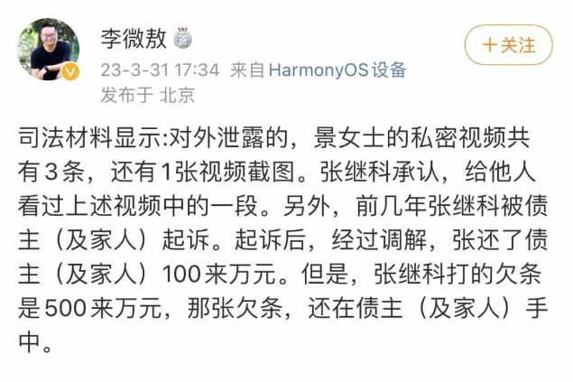 该声明发出后,3月31日,微博用户“李微敖”就此事发布多条微博。他声称,他从几年前看到并掌握的部分司法材料得知,“张继科将景女士的私人视频,传给他人,此情况属实。”