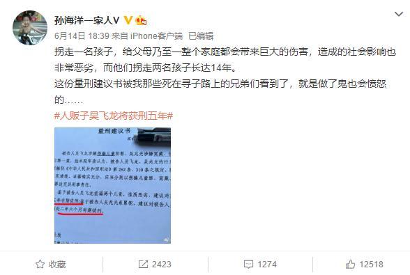 据此前报道,2022年6月14日,孙海洋在网上晒出一份检方量刑建议书,文中显示被告人吴某龙涉嫌拐骗儿童犯罪一案,经该院审查认为,鉴于被告人吴某龙拐骗两个儿童,性质恶劣,建议对其判处五年有期徒刑。