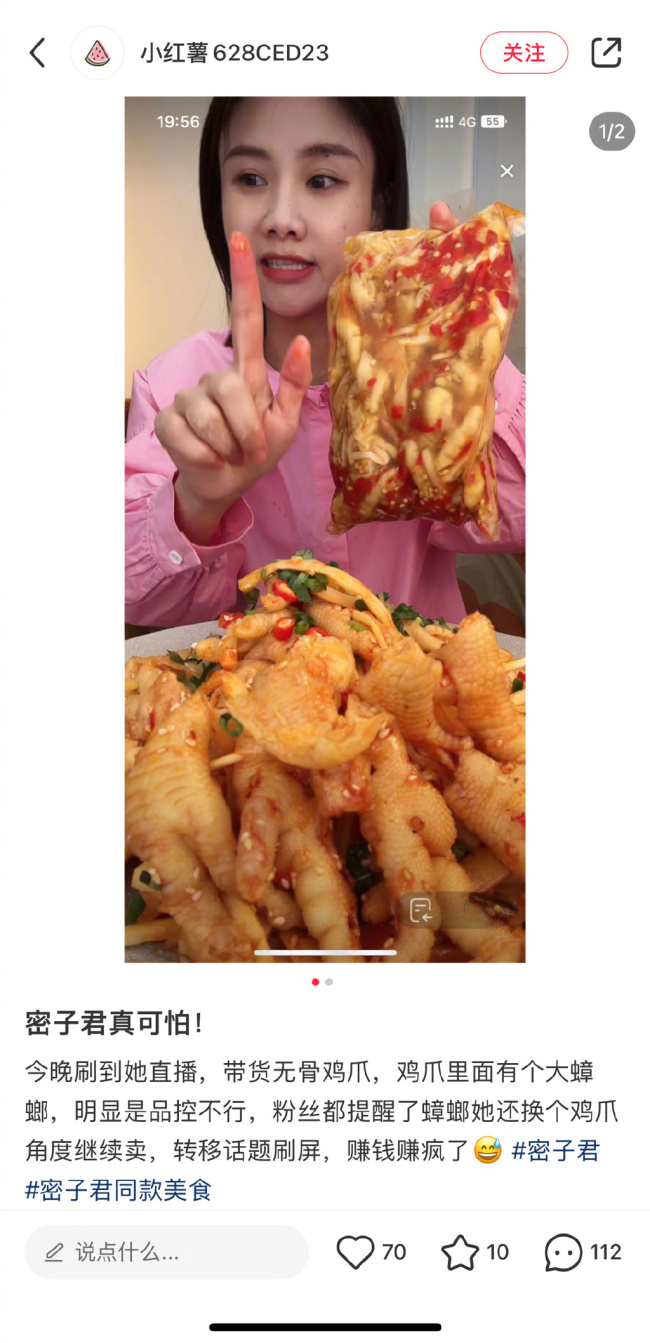 直播中,有网友发现鸡爪里有一个大蟑螂,经由粉丝各种提醒之后,密子君并没有更换产品,只是把那一盘疑似有蟑螂的鸡爪换了个角度继续播,引发热议。