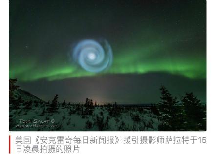 报道称,目睹这一“奇观”的人中包括托德·萨拉特,他是一名专门在户外拍摄北极光的摄影师。当地时间15日凌晨,正在进行日常工作的他捕捉到了这一景象。报道称,根据萨拉特的描述,当时北边地平线上突然出现了一道明亮的光,随着它的靠近,这股光迅速呈现出螺旋形。随后,蓝白色的螺旋似乎开始快速移动。萨拉特说,大约五分钟后,它几乎就在头顶上了。