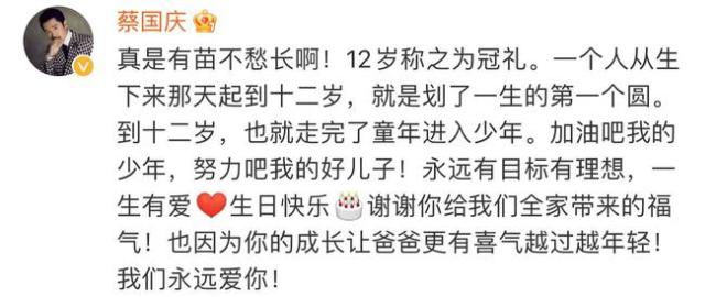 事实上,此前蔡国庆还发文,感叹地表示“真是有苗不愁长啊”,并祝儿子生日快乐,感谢儿子的降生给全家带来福气,也谢谢他的成长,让自己越过越年轻。