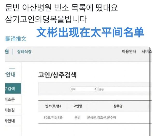 据韩媒,文彬的灵堂设在首尔峨山医院,亲人的最后一栏写的是妹妹的名字。