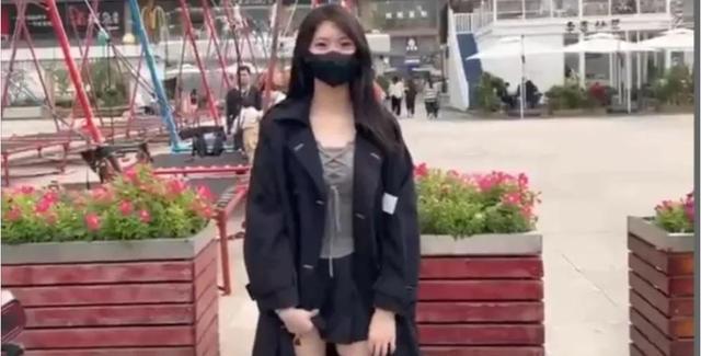 虽然外穿一件长大衣,可是里面却身穿黑丝等暴露的服装,时不时掀起上衣和裙子,或者扭动自己的身体等。