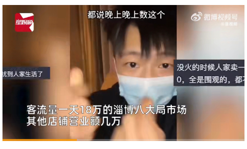 客流量一天18万的淄博八大局市场,其他店铺营业额几万,而他的营业额从原本的10000多到现在一天仅6000元。不少游客去到八大局都发现鸭头小哥店门紧闭,还贴着暂停营业几个大字。有网友称因店铺周围人群太多,影响市场秩序和其他店营业,无奈关停店铺。