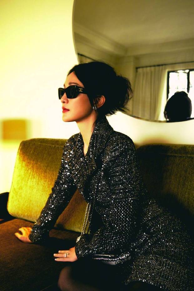 周迅着黑色亮片西装酷飒十足。