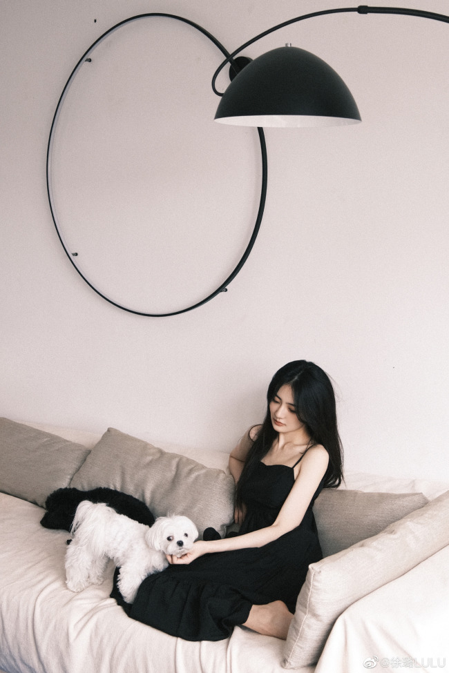 徐璐在个人社交平台晒出一组黑色连衣裙造型随拍,她披散长发在沙发上随意放空自我,尽显慵懒随性,与小狗互动表情呆萌。
