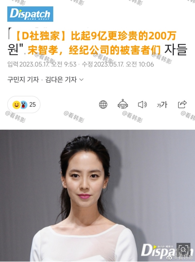 【我的天!宋智孝被公司拖欠9亿工资】据韩媒爆料,宋智孝签约uzurocks公司后总计为公司创收12亿韩元,但uzurocks公司却一次都没有与宋智孝分账,至今已拖欠宋智孝超过9亿韩元(约合人民币470万元)。