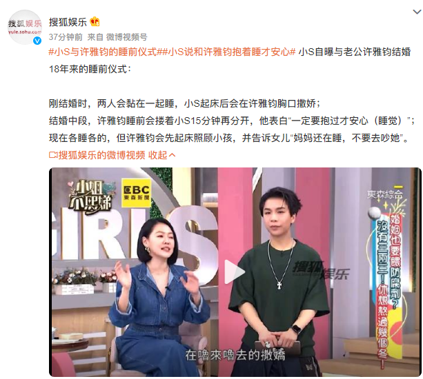 近日,小S在节目中自曝与老公许雅钧结婚18年来的睡前仪式,她说刚结婚时,两人会黏在一起睡,自己起床后会在许雅钧胸口撒娇。到了结婚中段,老公许雅钧则会在睡前搂着自己15分钟再分开。现在就是各睡各的,但许雅钧会先起床照顾小孩,并告诉女儿“妈妈还在睡,不要去吵她”。