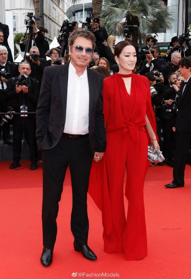 巩俐携手老公Jean Michel Jarre一同亮相《夺宝奇兵5》首映戛纳红毯,带有披风的红色裤装造型,美得明艳大气!57岁的巩皇,这状态也太逆天了!