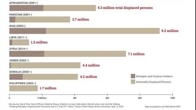 报告称,仅在2010年—2019年期间,全球难民数量就从4100万激增到7950万,几乎翻了一番;从2001年开始,美国至少发动或参与了8场战争。保守来看,美军战争导致了至少3700万人逃离家园,实际上其导致的难民人数或高达5900万,从规模上来说,是自1900年以来,仅次于二战造成的难民潮。