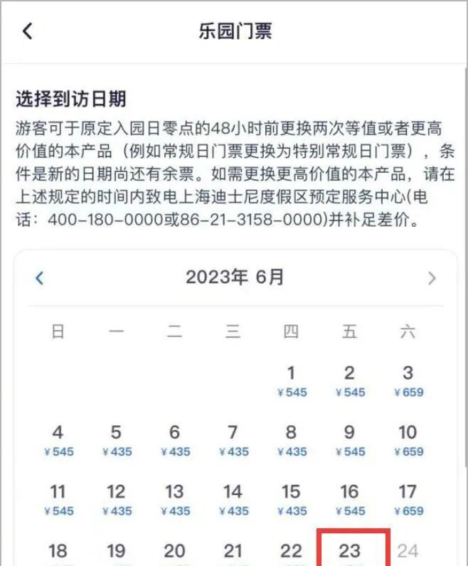目前,在迪士尼度假区APP上已可购买上海迪士尼乐园6月23日的门票,价格略有上涨。