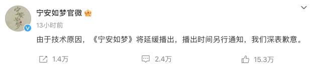 然而,《宁安如梦》并未如约而至。5月19日晚,官微发文称:“由于技术原因,《宁安如梦》将延缓播出,播出时间另行通知,我们深表歉意。”