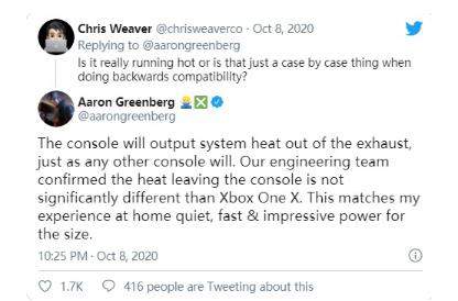 “这款游戏机会从排气管输出系统热量,如同别的游戏机一般。我们的工程团队确认,脱离主机的热量与XboxOneX并无显著区别,这与我在家中的体验相吻合,安静、快速&令人印象深刻的大小功率,”AaronGreenberg写道。