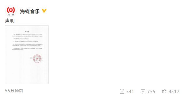 26日,海蝶音乐发布声明函,称公司艺人许嵩被不实言论及虚假信息造谣抹黑,对艺人名誉造成了严重侵害,要求相关网络用户立即删除针对许嵩的不实言论及虚假信息。还称已委托律师事务所对上述侵权内容进行证据保全,对于侵害我司艺人合法权益的行为,保留使用诉讼等一切必要手段追究其法律责任的权利。